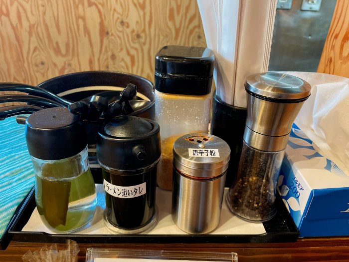 卓上には、唐辛子、昆布酢、ブラックペッパーなど。