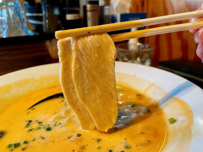 低温調理されたであろう鶏チャーシューはさっぱりとしつつ柔らかで食べやすい。